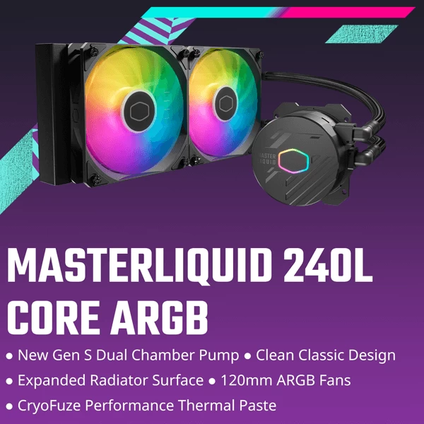 Cooler Master has built upon the classic MasterLiquid L Series to present a redesigned and improved release of the MasterLiquid 240L Core ARGB. Featuring new design elements that bring a classic minimalist look to the series, the MasterLiquid 240L Core ARGB represents Cooler Master’s ongoing innovative spirit.